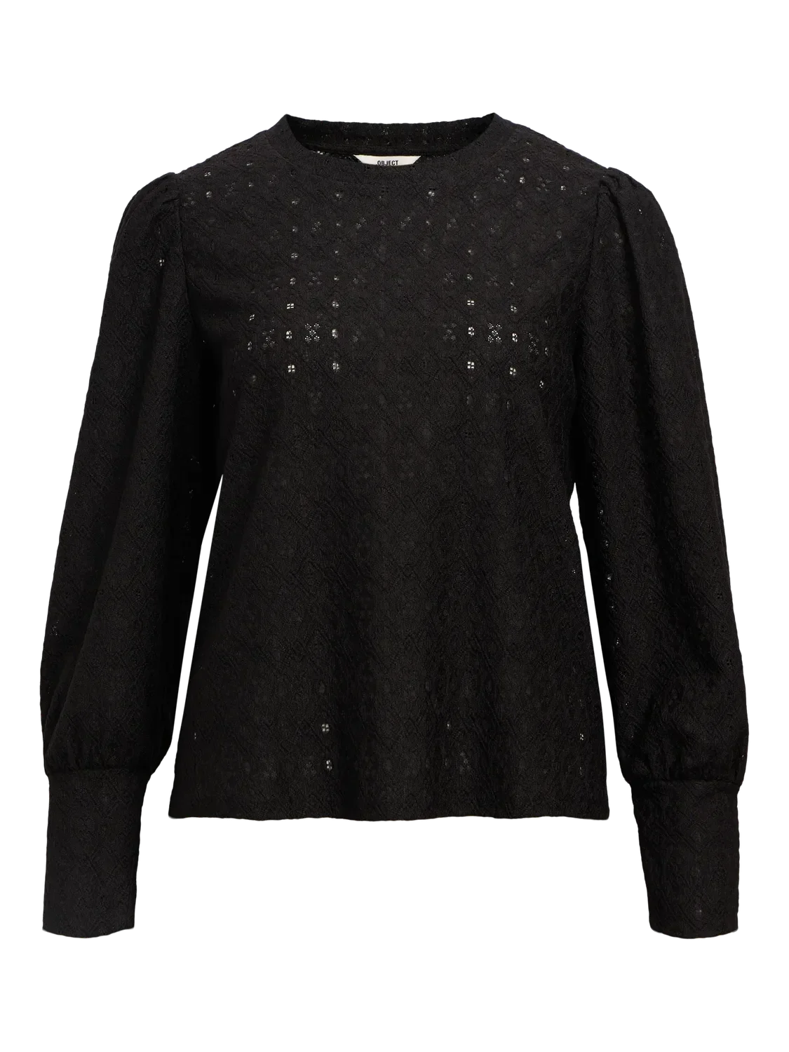 Top met lange mouwen van het merk Object. De top heeft een opengewerkt patroon, ronde hals en subtiele ballonmouwen. Object kleur: Black. 98% Polyester & 2% Elastane.