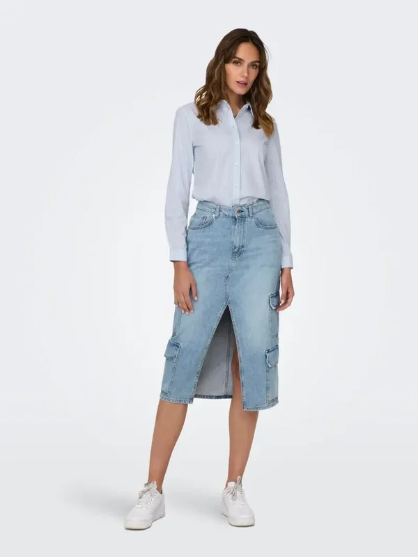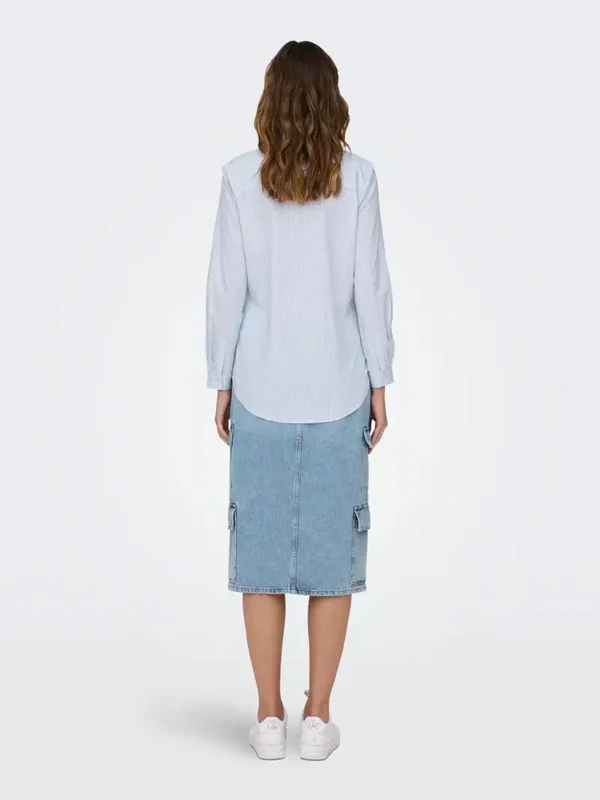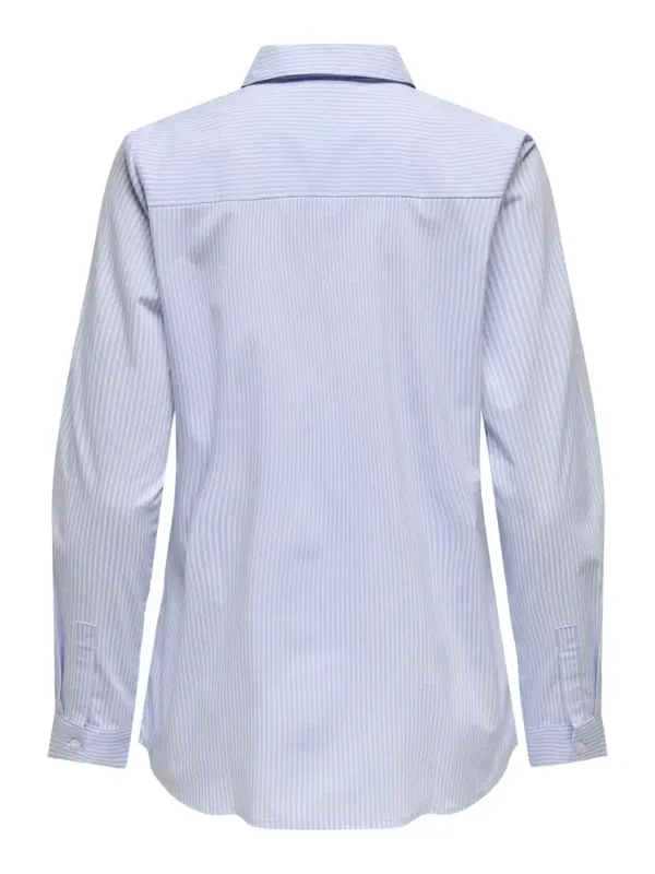Overhemdblouse van het merk JDY. Met knoopsluiting, lange mouwen en kraagje. Lichtblauw/wit gestreept. 72% Katoen, 24% Polyester & 4% Elastane.