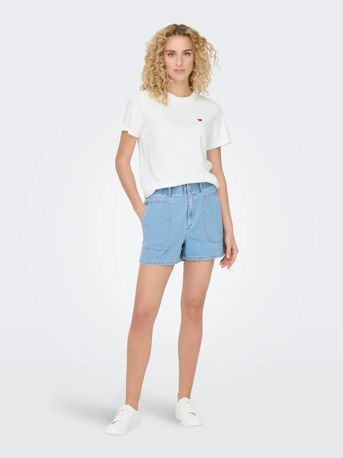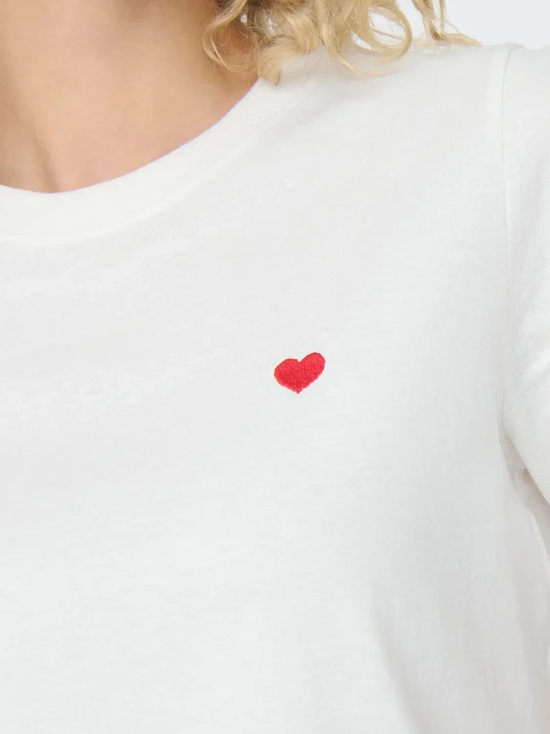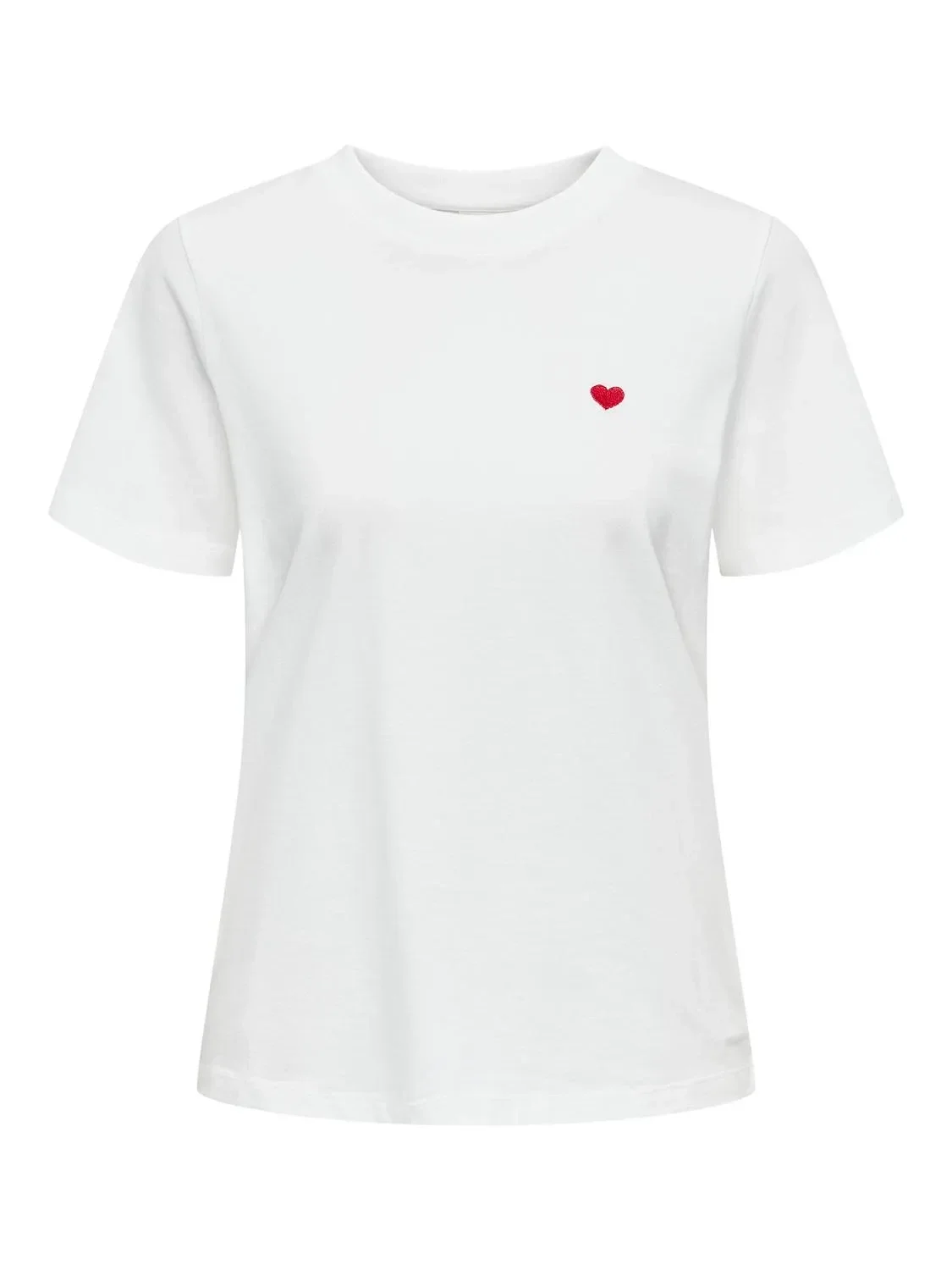 Wit t-shirt met korte mouwen van het merk JDY. Het t-shirt heeft een rood hartje op de linkerborst. 100% Katoen.