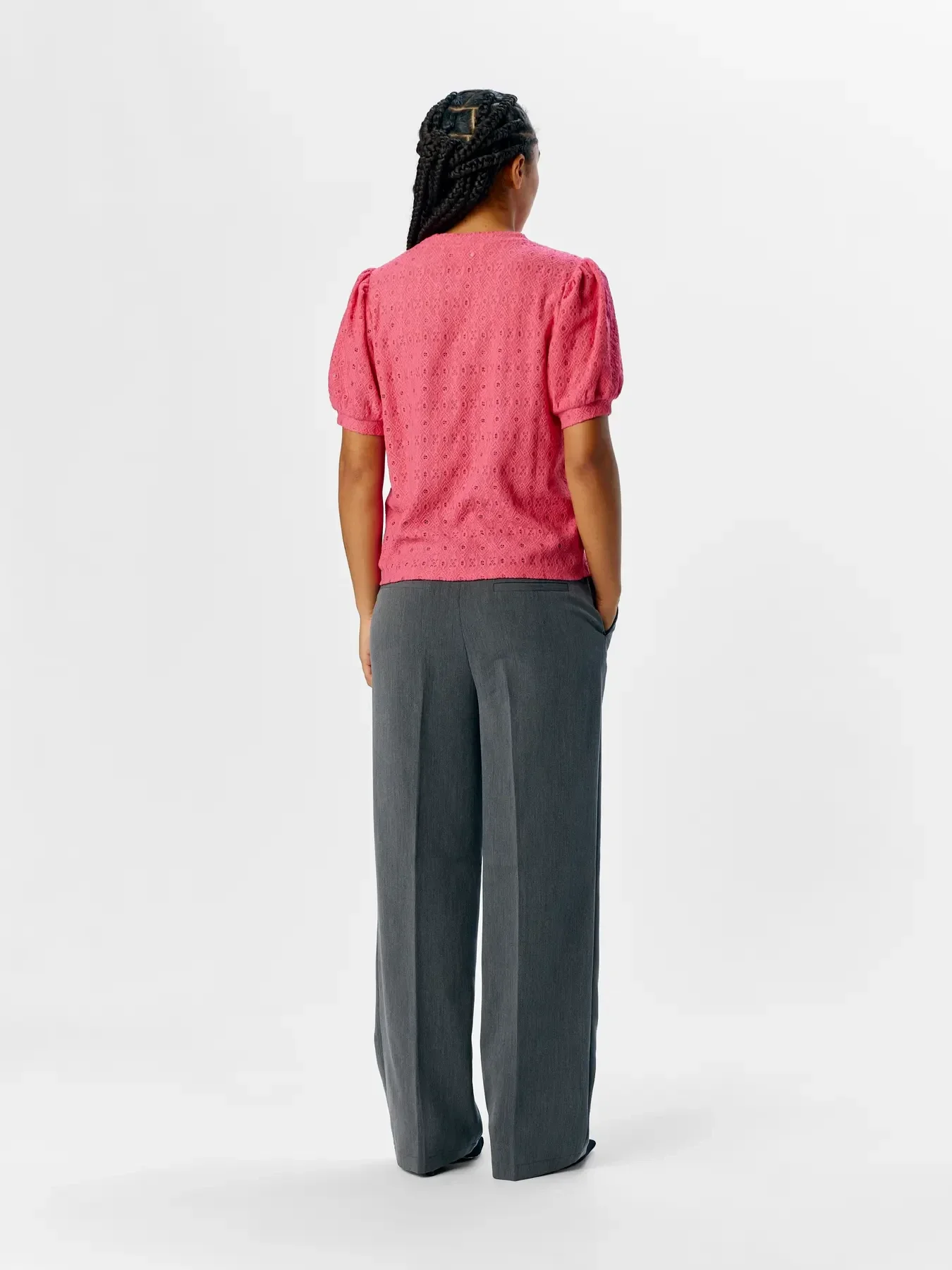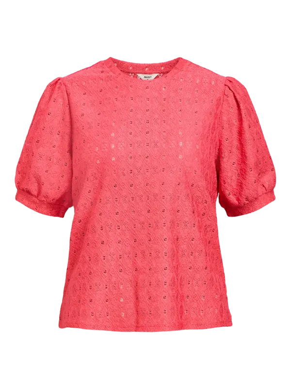 Top met pofmouwen van het merk Object. Object kleur: Raspberry Sorbet. 98% Gerecycled Polyester & 2% Elastane.