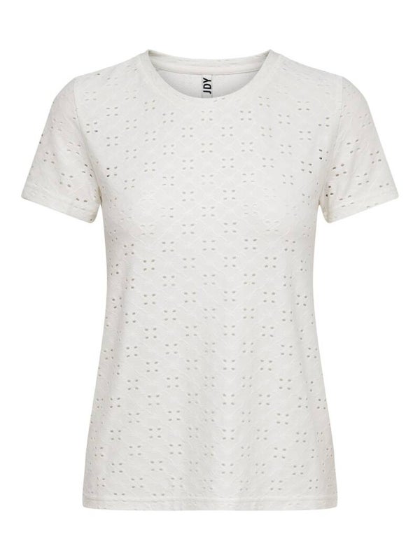 Top met korte mouwen van het merk JDY. Het shirtje heeft all-over embroidery en een ronde hals. JDY kleur: Cloud Dancer. 92% Polyester & 8% Elastane.
