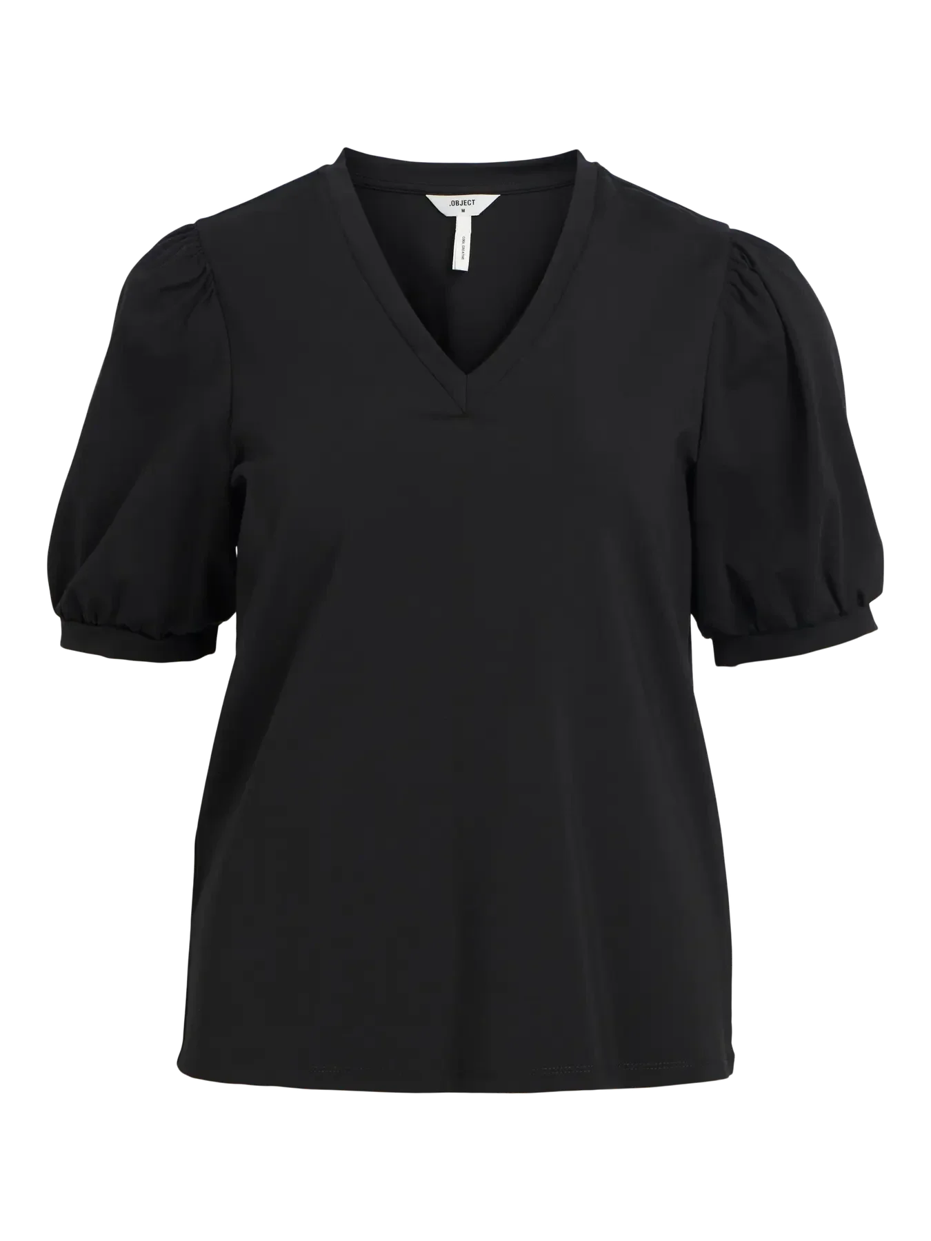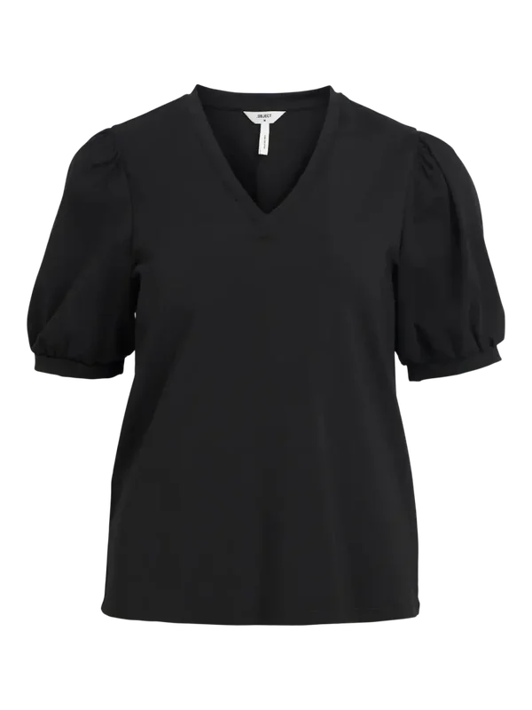 Top met pofmouwen van het merk Object. De top heeft een v-hals. Object kleur: Black. 60% Viscose LENZING™ECOVERO™, 35% Nylon & 5% Elastane.
