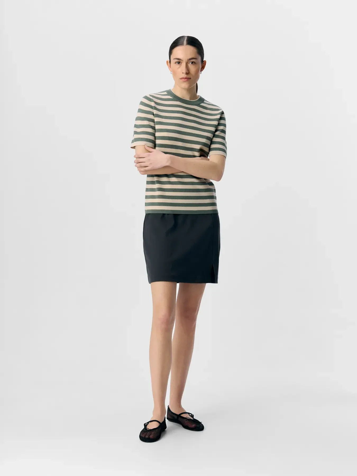 Gebreide top met korte mouwen van het merk Object. Gestreepte print in groen en ecru. Object kleur: Laurel Wreath/Sandshell. 70% Viscose & 30% Gerecycled Polyester.