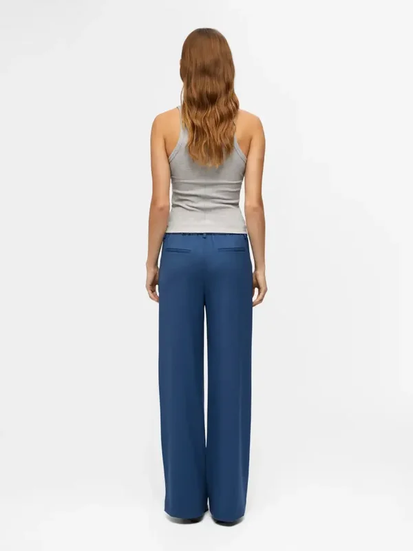 Wijd model pantalon van het merk Object. De pantalon heeft een elastieken band achter en steekzakken voor. Object kleur: Dark Denim. 50% Gerecycled Polyester , 32% Viscose, 13% Polyester & 5% Elastane.