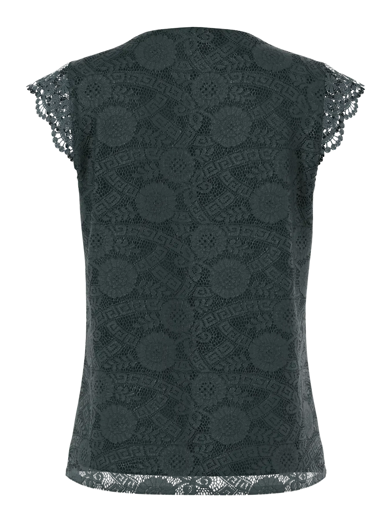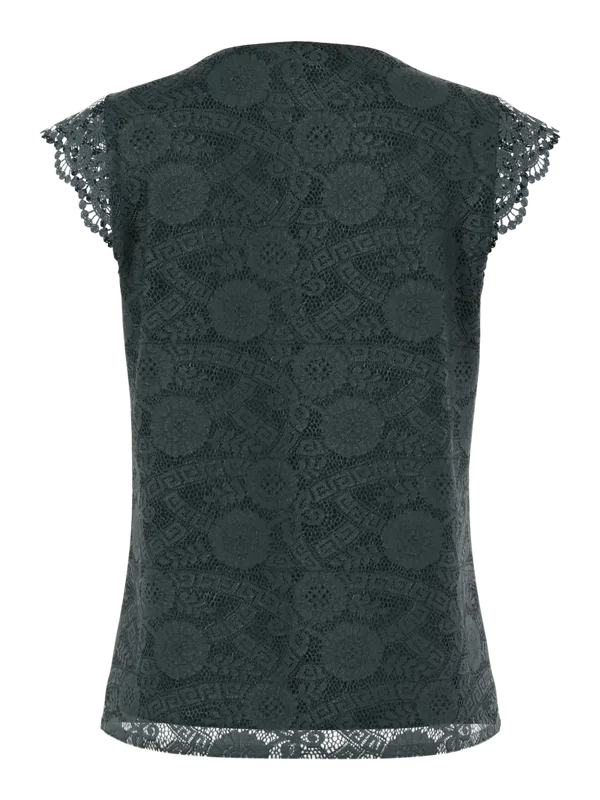 Kanten top met v-hals van het merk Pieces. De top is gevoerd en schijnt dus niet door. Pieces kleur: Darkest Spruce. 70% Nylon, 20% Gerecycled Nylon & 10% Elastane.
