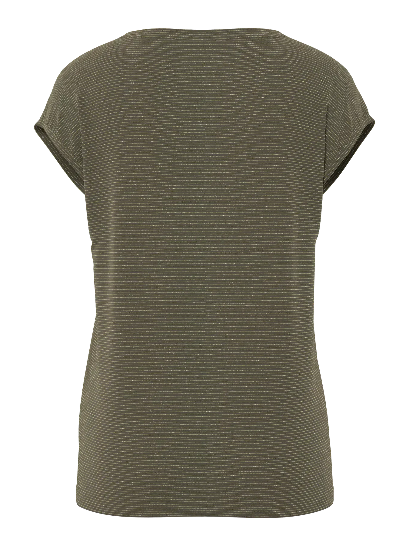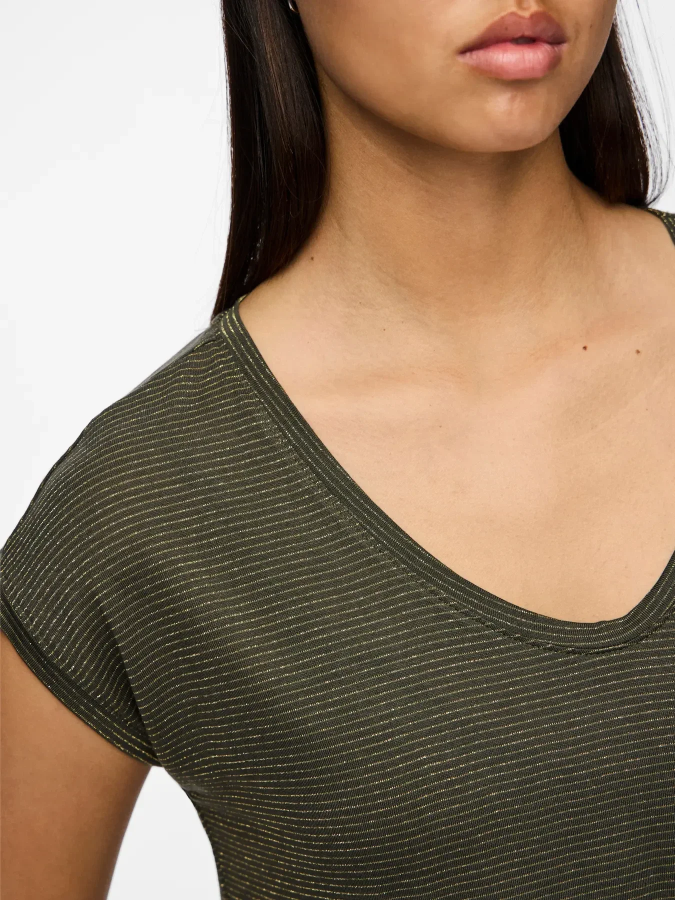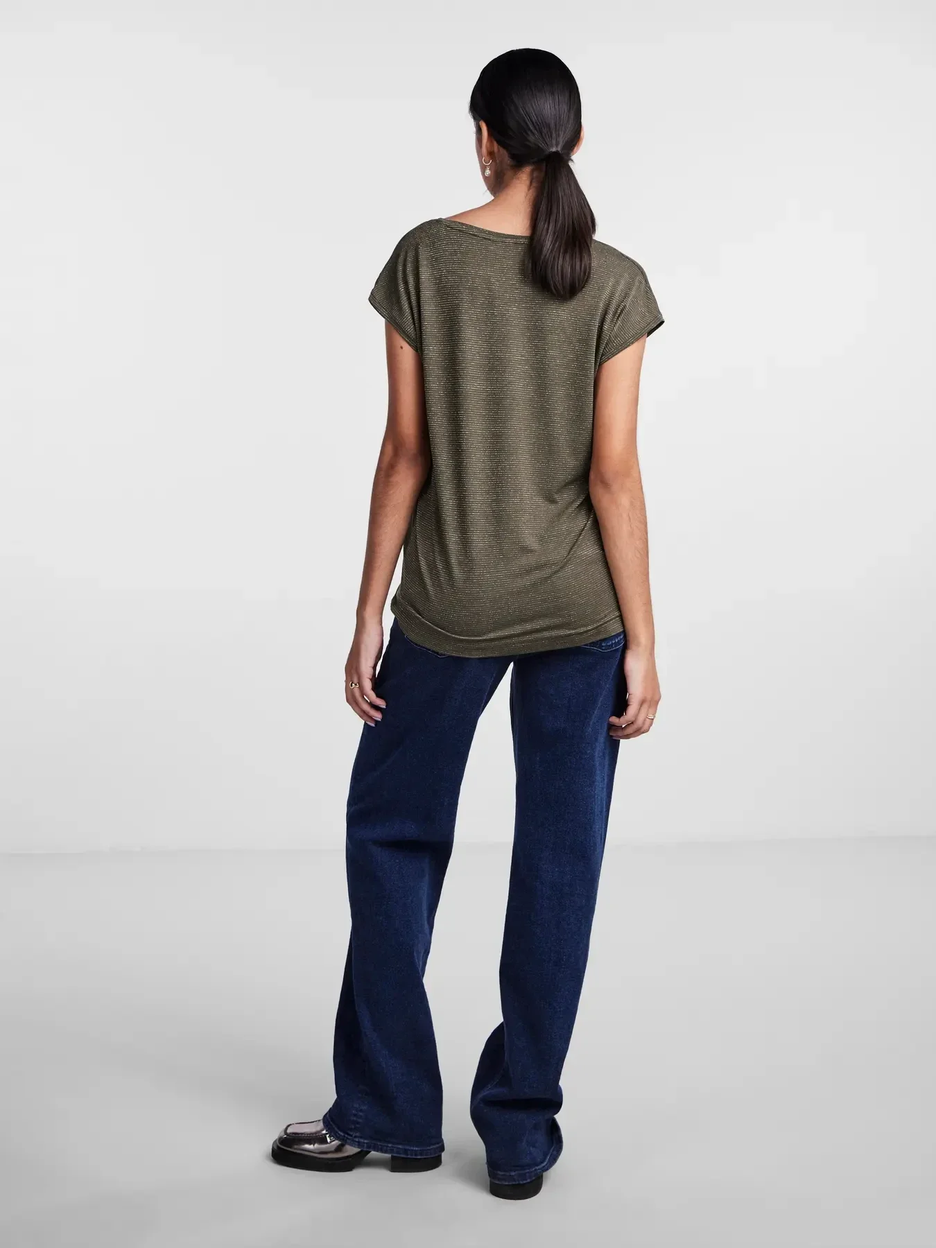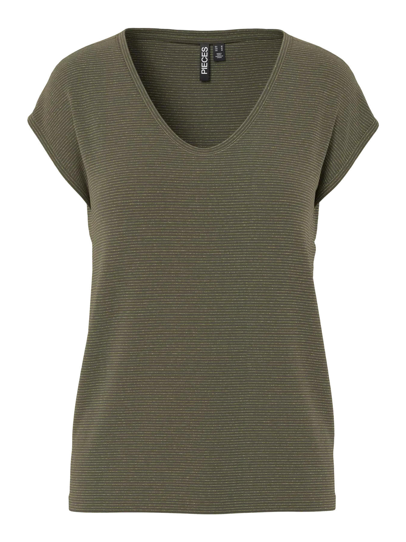 Fijne top van het merk Pieces. De legergroene top is gemaakt van een jersey/t-shirt stof met goudkleur lurex erdoor. Ovale halslijn. Pieces kleur: Grape Leaf. 85% Viscose, 10% Metallic Fibers & 5% Elastane.
