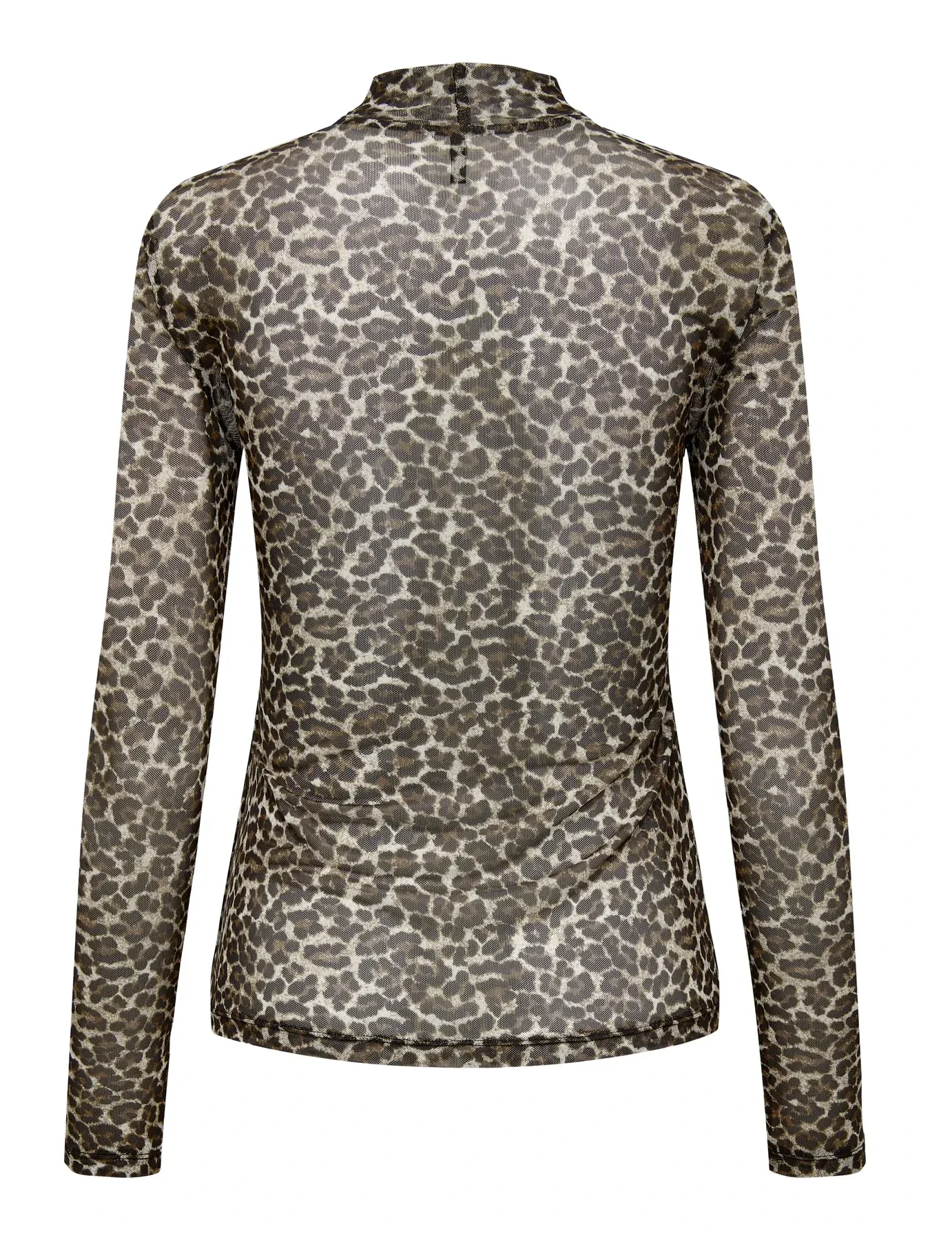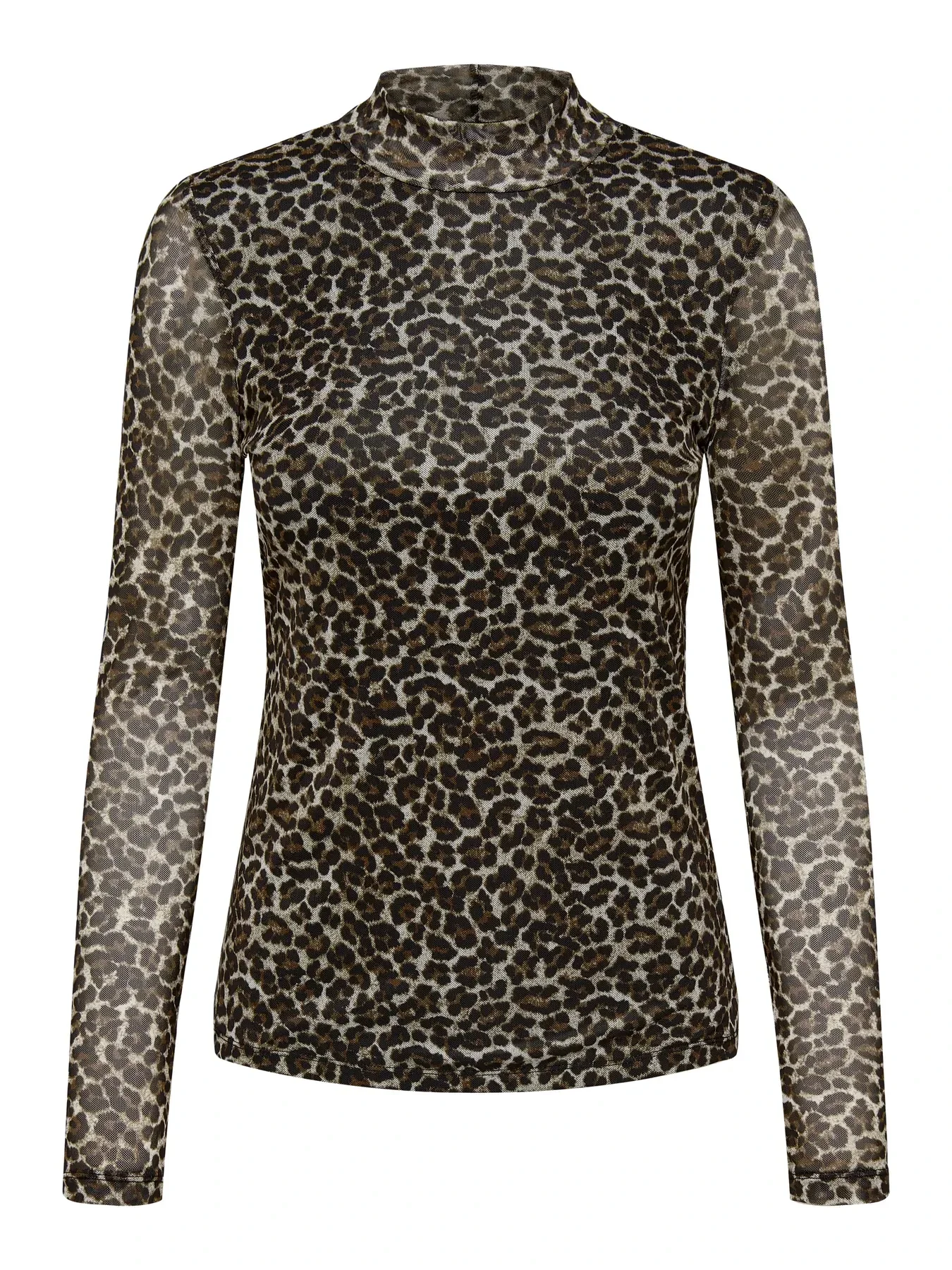 Leopard print mesh top van het merk Only. De mesh top heeft een turtle neck en lange mouwen. De voorkant is gevoerd en schijnt niet door, de achterkant is niet gevoerd en schijnt licht door. Only kleur: Pumice Stone Everyday Leo. 95% Gerecycled Polyester & 5% Elastane.