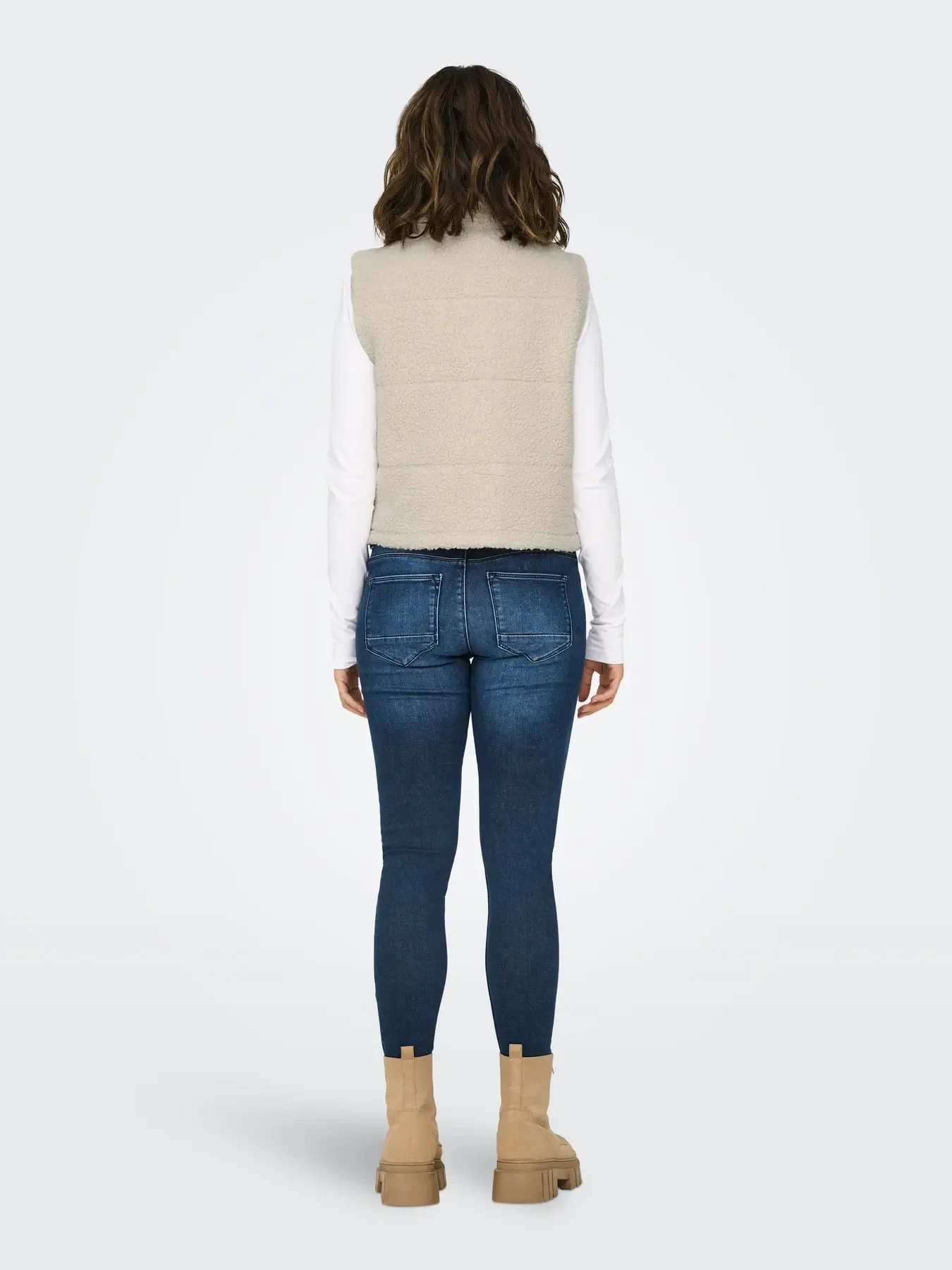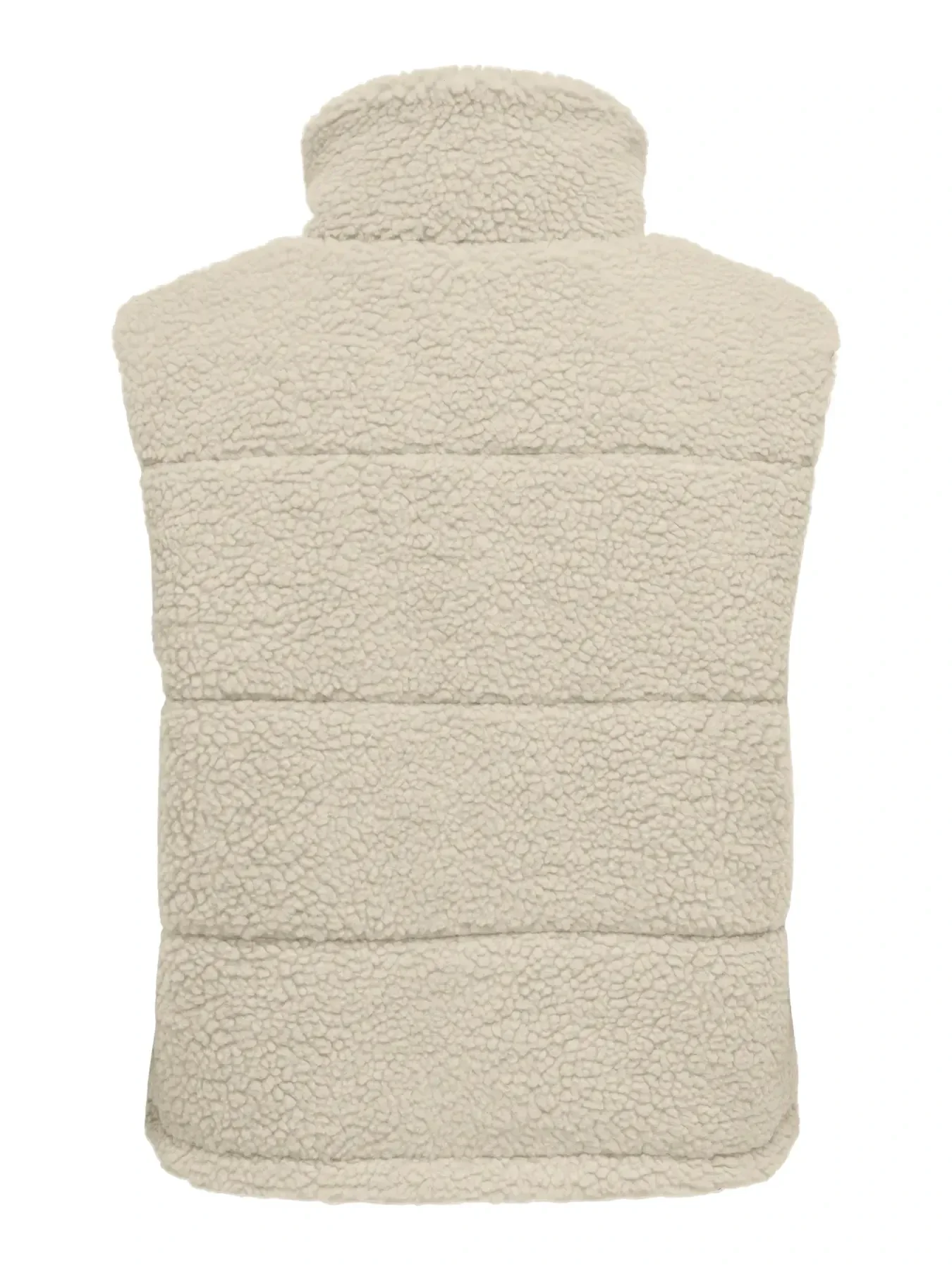 Teddy bodywarmer van het merk Only. De bodywarmer heeft steekzakken en sluiting van drukknopen. Het model is redelijk kort. Only kleur: Pumice Stone. 100% Gerecycled Polyester.