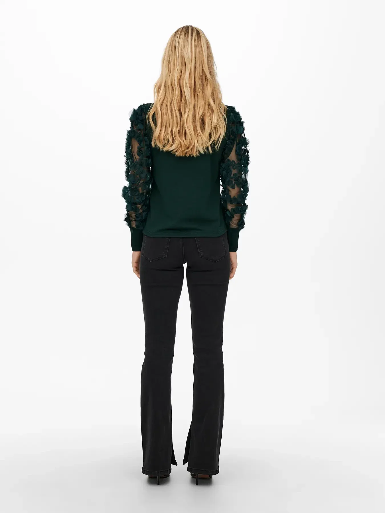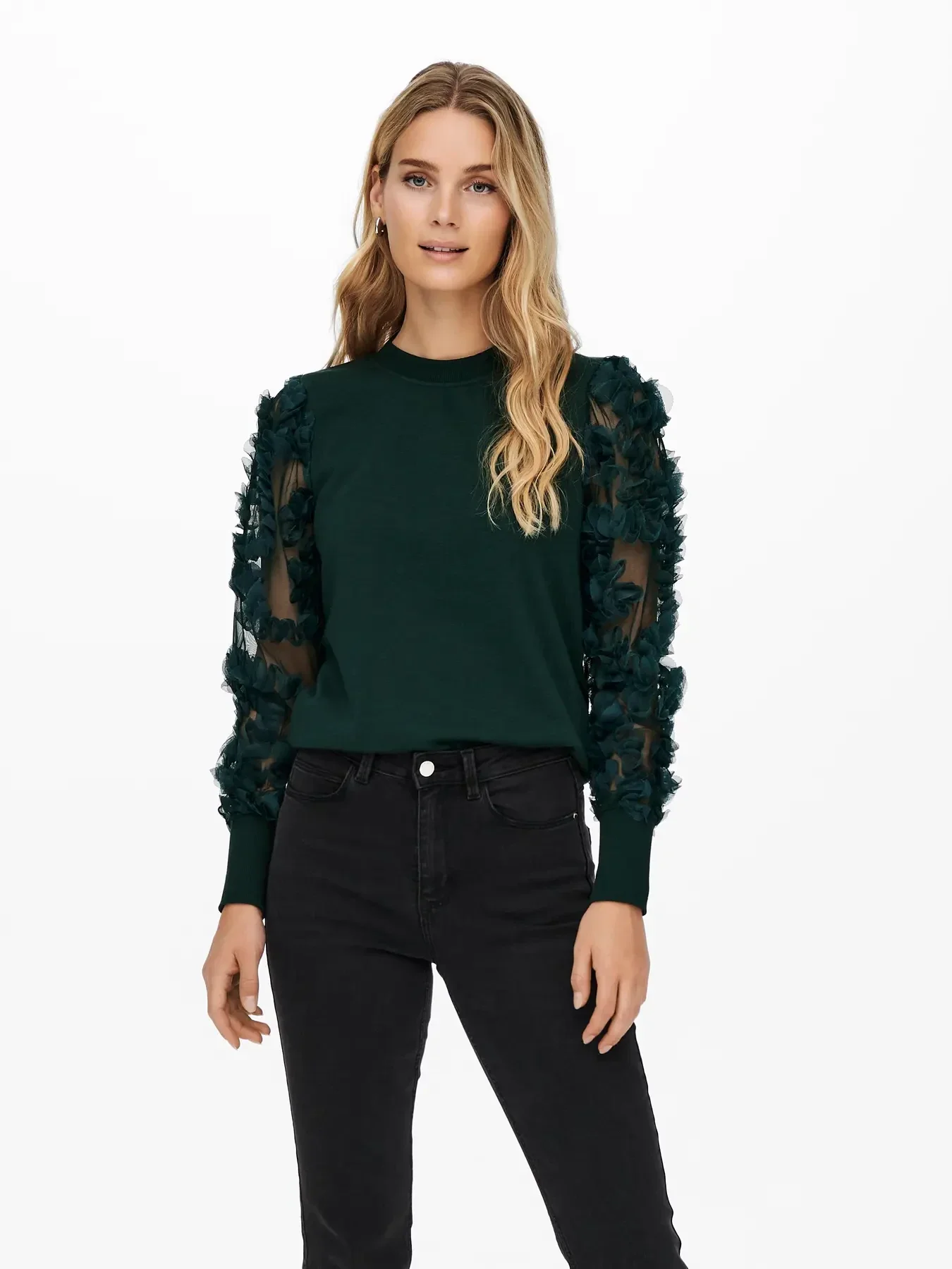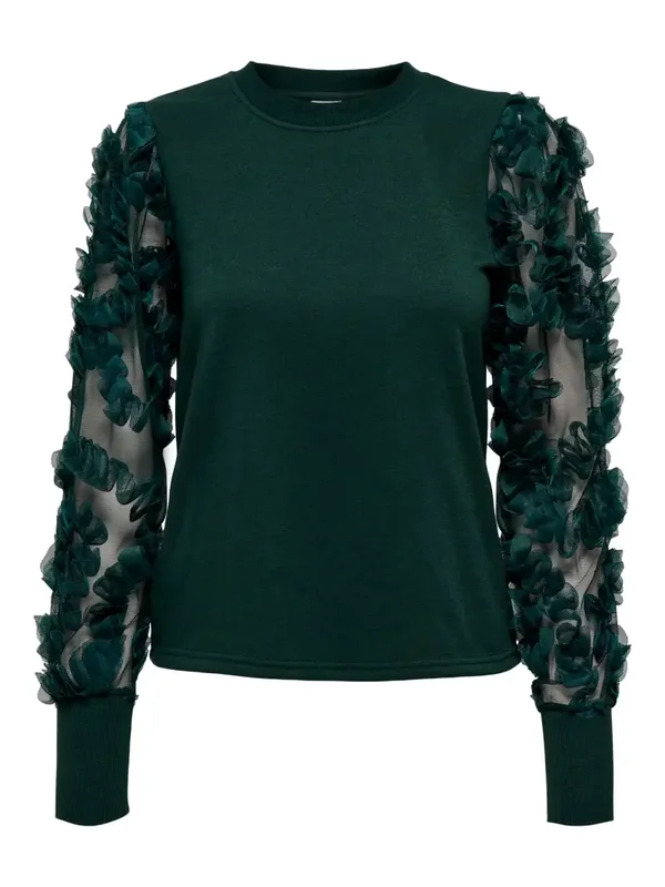 Donkergroene met details van het merk JDY. De sweater heeft een ronde hals en mesh details aan de mouwen. JDY kleur: Ponderosa Pine. 65% Gerecycled Polyester & 35% Katoen.