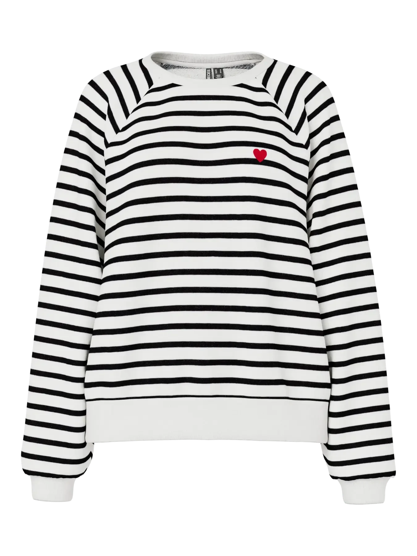 Gestreepte sweater van het merk Pieces. De sweater heeft een offwhite ondergrond met zwarte strepen. Ook heeft de sweater een rood hartje op de linkerborst. 78% Katoen & 22% Polyester.