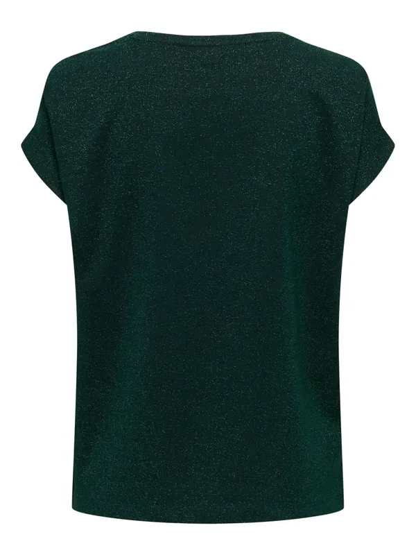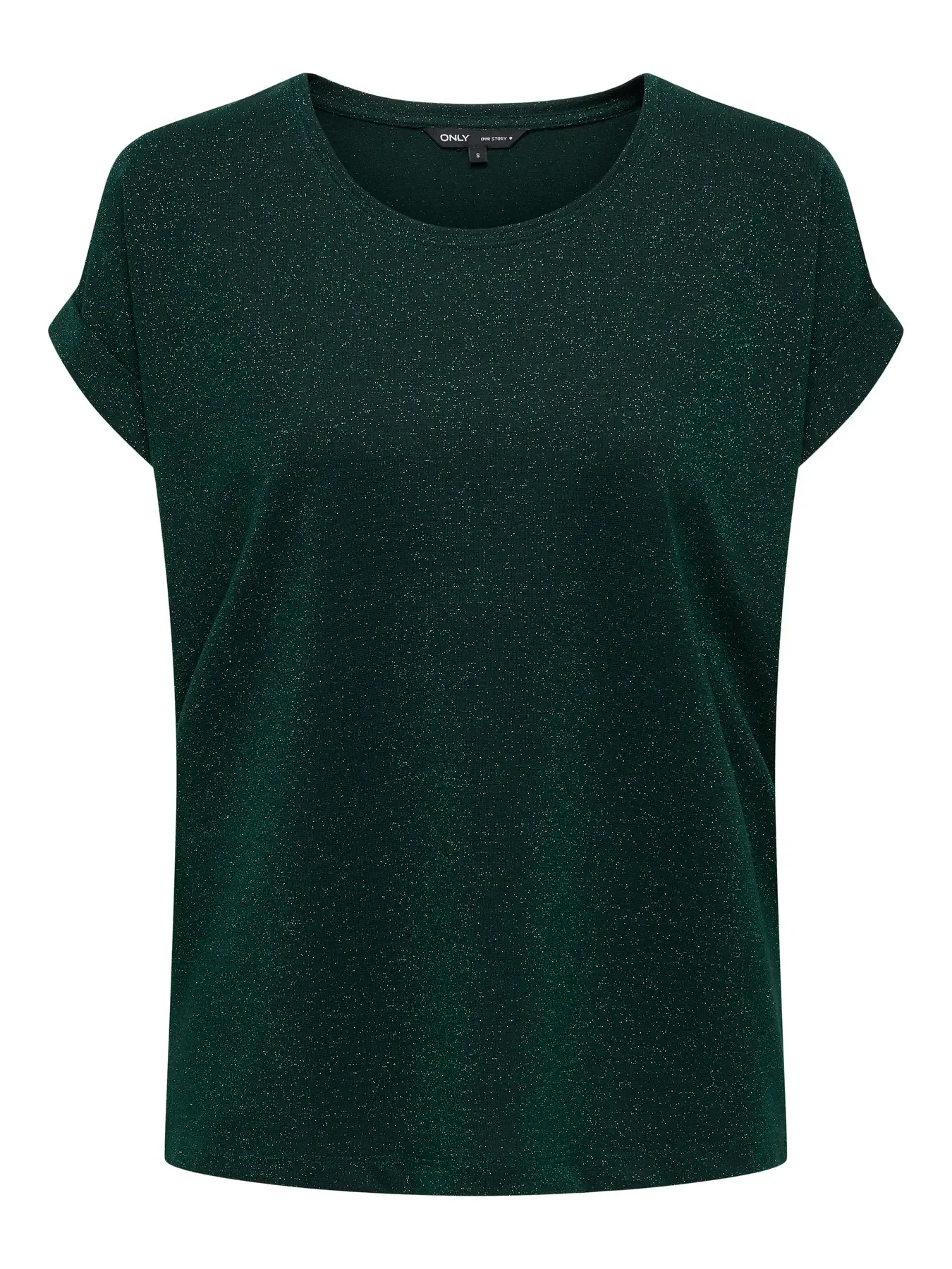 Donkergroene glitter top met ronde hals van het merk Only. Fijne kwaliteit met stretch. Only kleur: Scarab. 75% Viscose, 11% Metallic Fibres, 11% Polyester & 3% Elastane.