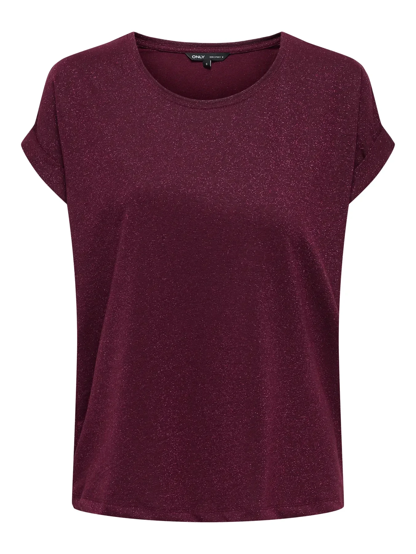 Donkerrode glitter top met ronde hals van het merk Only. Fijne kwaliteit met stretch. Only kleur: Chocolate Truffle. 75% Viscose, 11% Metallic Fibres, 11% Polyester & 3% Elastane.