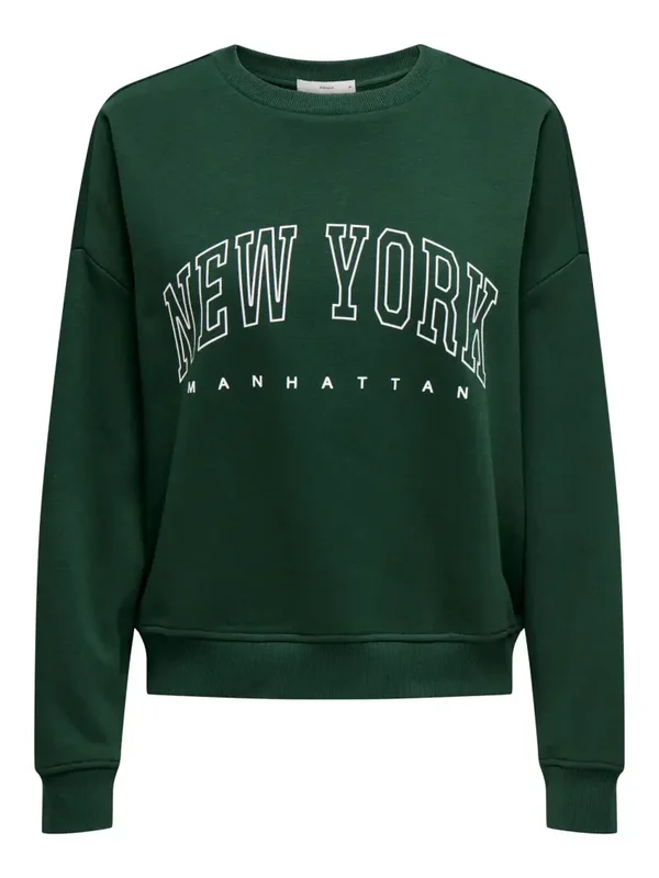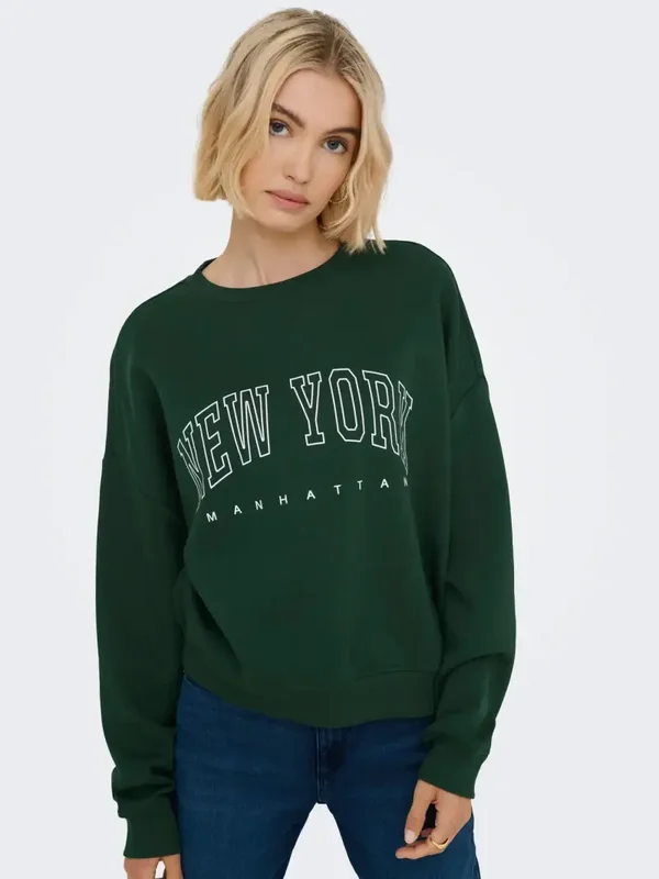 Sweater met opdruk van het merk Only. De donkergroene sweater heeft de witte tekst New York als opdruk. De sweater heeft een ronde hals en lange mouwen. Only kleur: Pine Grove. 60% Katoen & 40% Gerecycled Polyester.