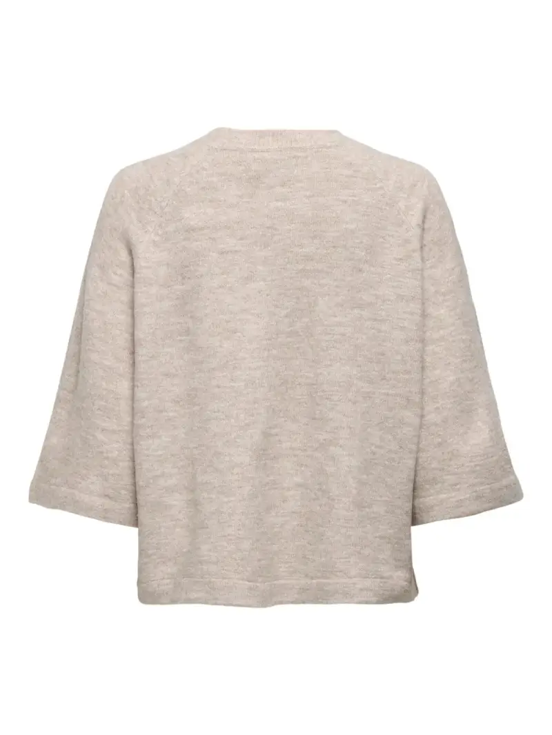 Wijdvallend truitje van het merk ONLY. Het truitje heeft 3/4 mouwen en een ronde hals. Only kleur: Pumice Stone Melange. 74% Acryl, 24% Polyester & 2% Elastane.
