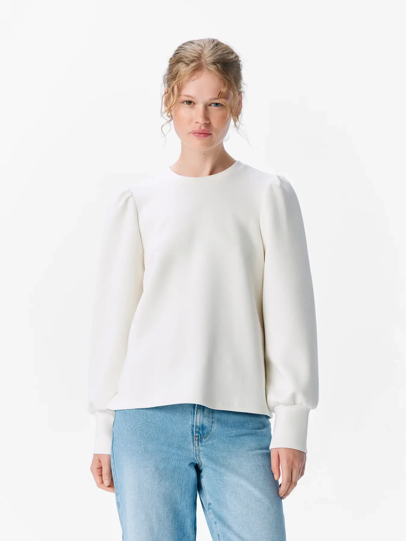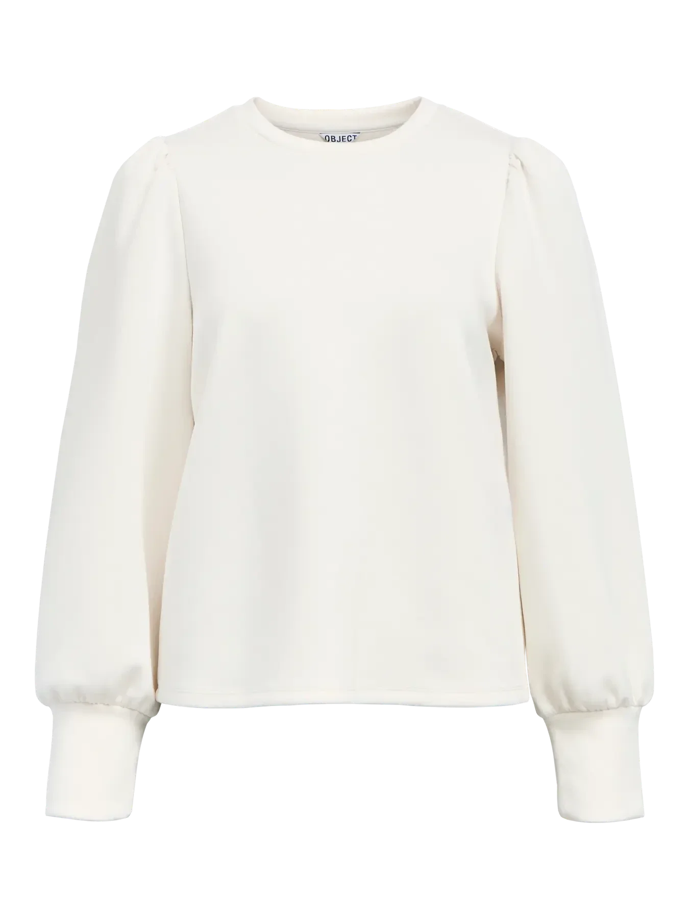 Sweater met pofmouwen van het merk Object. De sweater heeft een ronde hals en lange mouwen. Fijne zachte kwaliteit. Object kleur: White Sand. 65% Gerecycled Polyester, 30% Viscose LENZING™ECOVERO™ & 5% Elastane.
