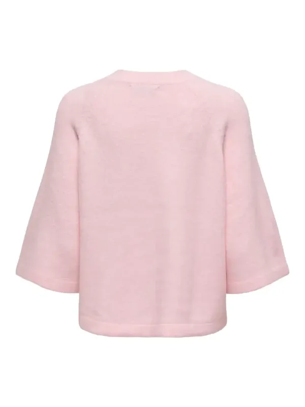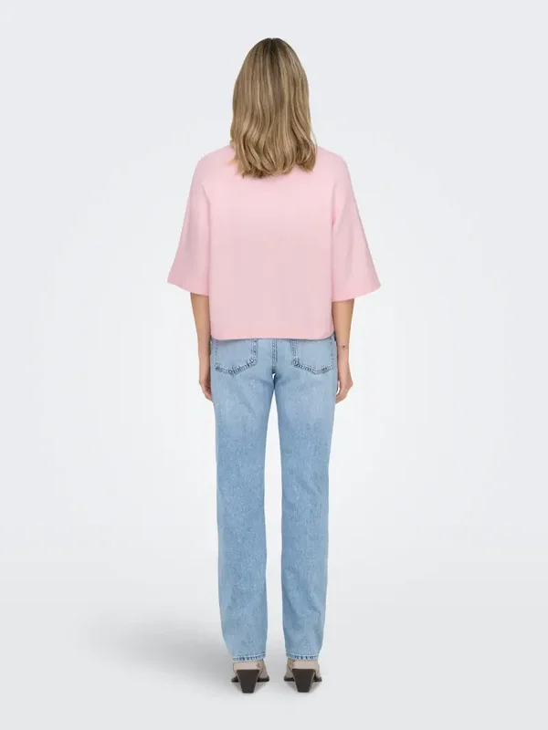 Wijdvallend truitje van het merk ONLY. Het truitje heeft 3/4 mouwen en een ronde hals. Only kleur: Potpourri. 74% Acryl, 24% Polyester & 2% Elastane.