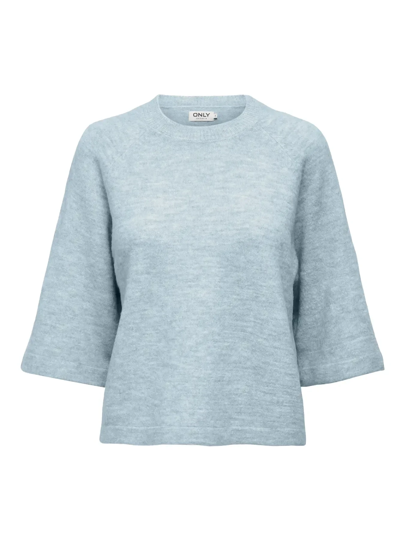 Wijdevallend truitje van het merk ONLY. Het truitje heeft 3/4 mouwen en een ronde hals. Only kleur: Mellow Yellow Melange. 74% Acryl, 24% Polyester & 2% Elastane.