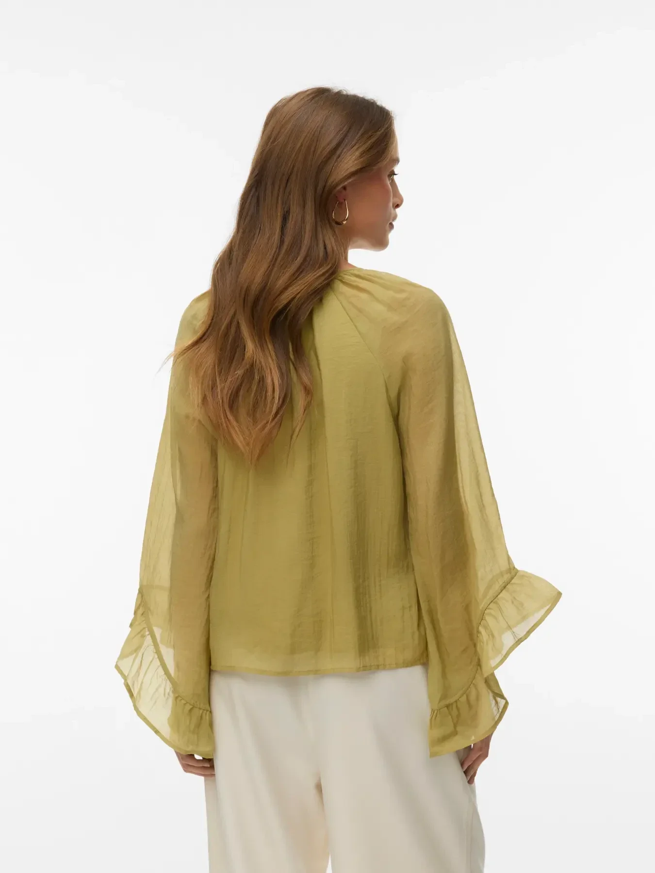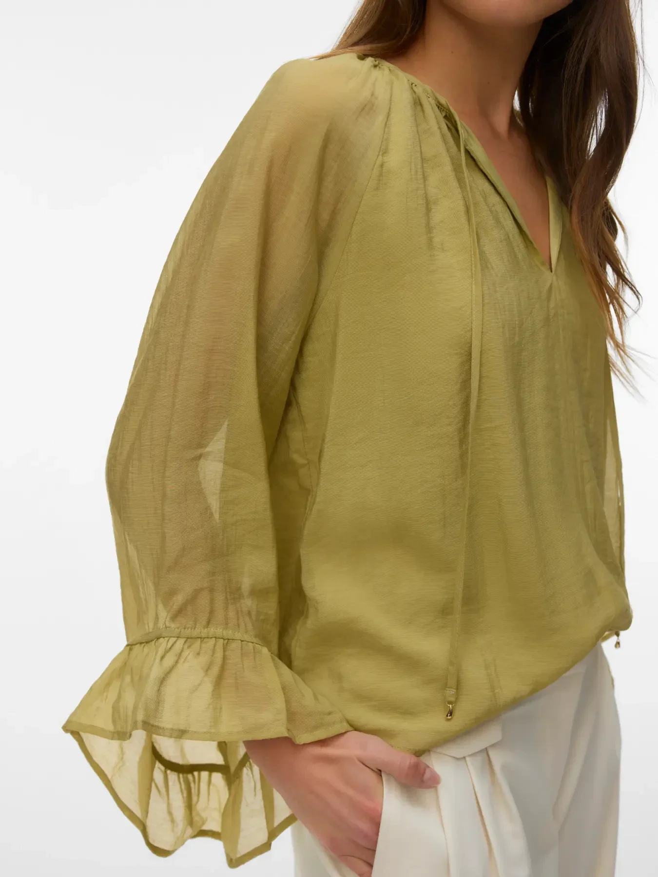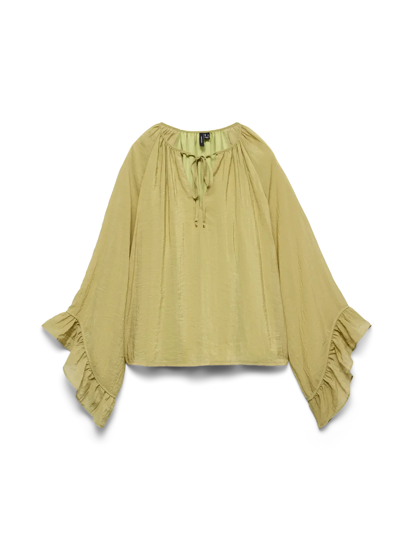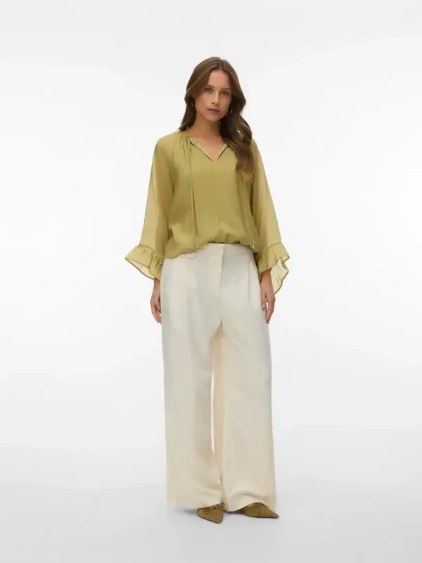 Blouse met wijde mouwen van het merk Vero Moda. De top heeft ruffles aan de mouwen en een strikdetail langs de hals. Vero Moda kleur: Winter Pear. 68% Viscose & 32% Polyamide.